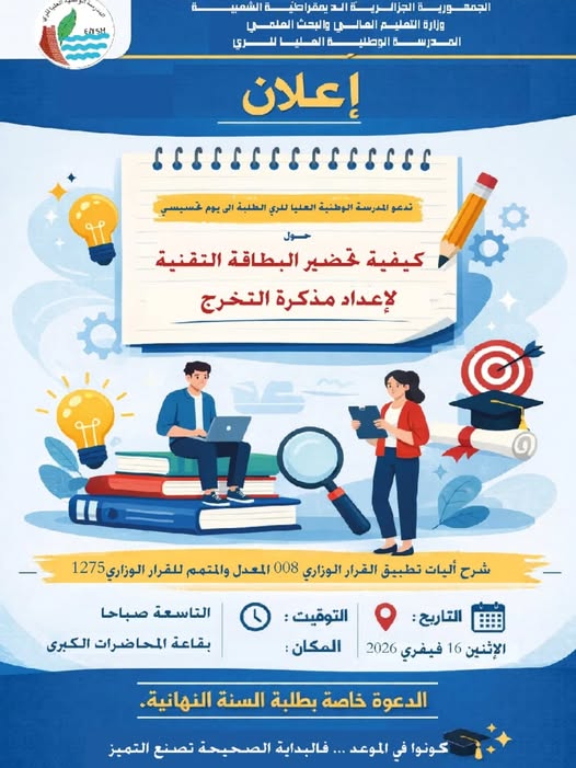 في إطار مرافقة طلبتنا الأعزاء في مسار إعداد مذكرات التخرج، وتنفيذًا لسياسة المؤسسة الرامية إلى تحسين جودة التأطير الأكاديمي، تُنظّم المدرسة يومًا تحسيسيًا موجّهًا إلى طلبة السنة النهائية حول: كيفية تحضير البطاقة التقنية لإعداد مذكرة التخرج. ويهدف هذا اللقاء إلى تمكين الطلبة المعنيين من فهم منهجية إعداد البطاقة التقنية بشكل سليم، والتخطيط الجيد لمشاريعهم البحثية، بما يضمن جودة المذكرات ونجاحها، إضافة إلى شرح آليات إعداد المذكرة في إطار القرار الوزاري …